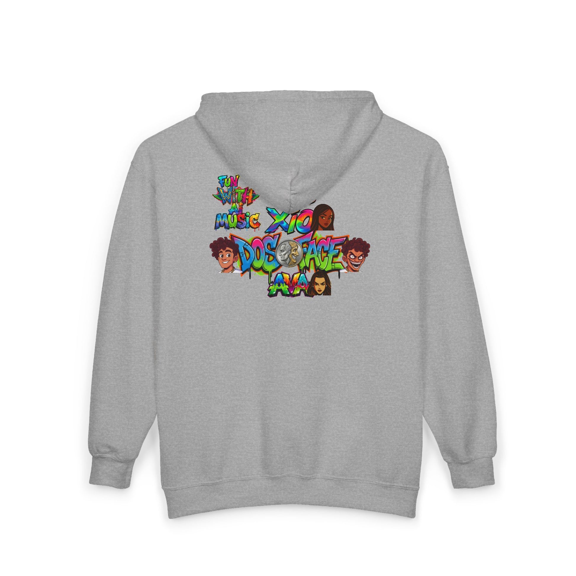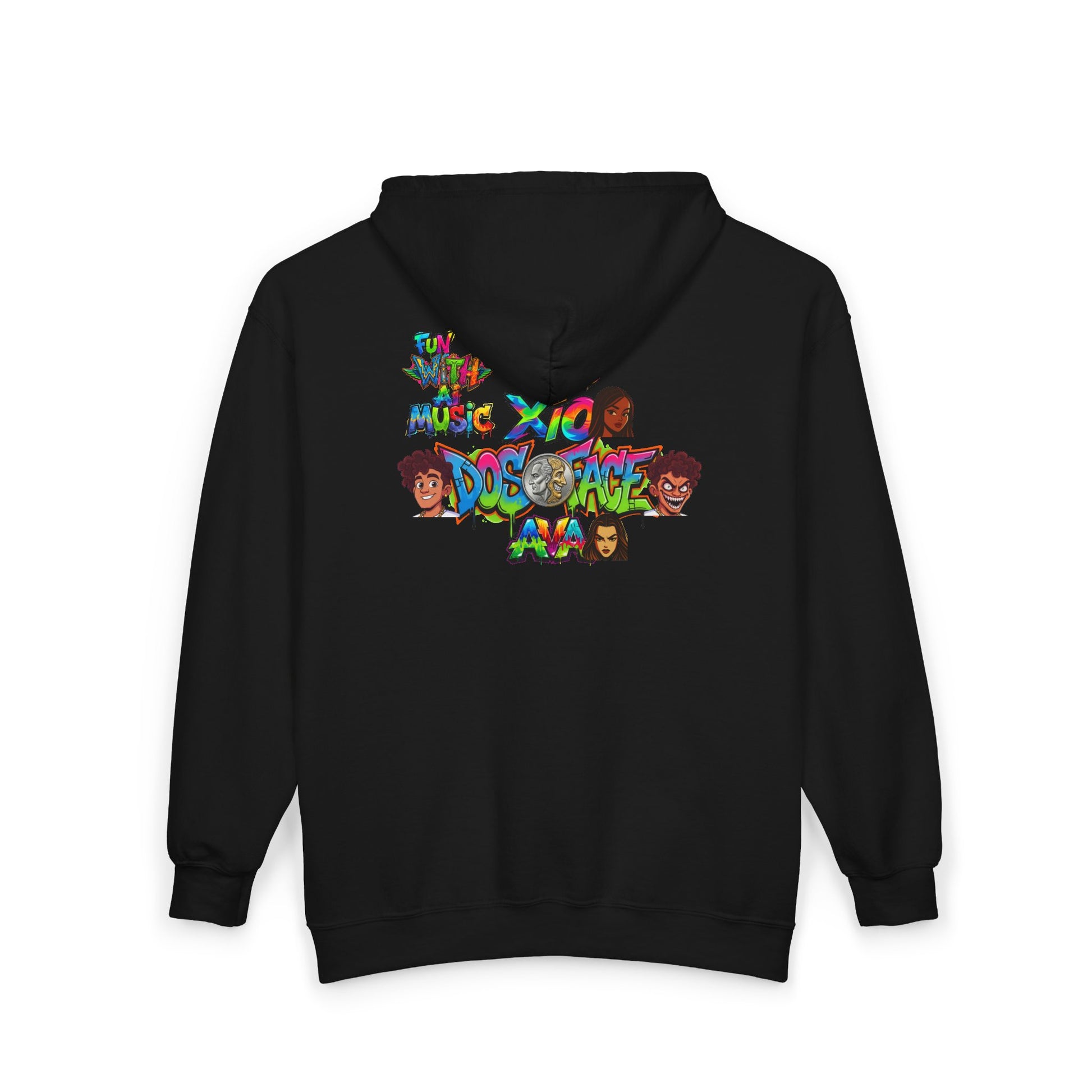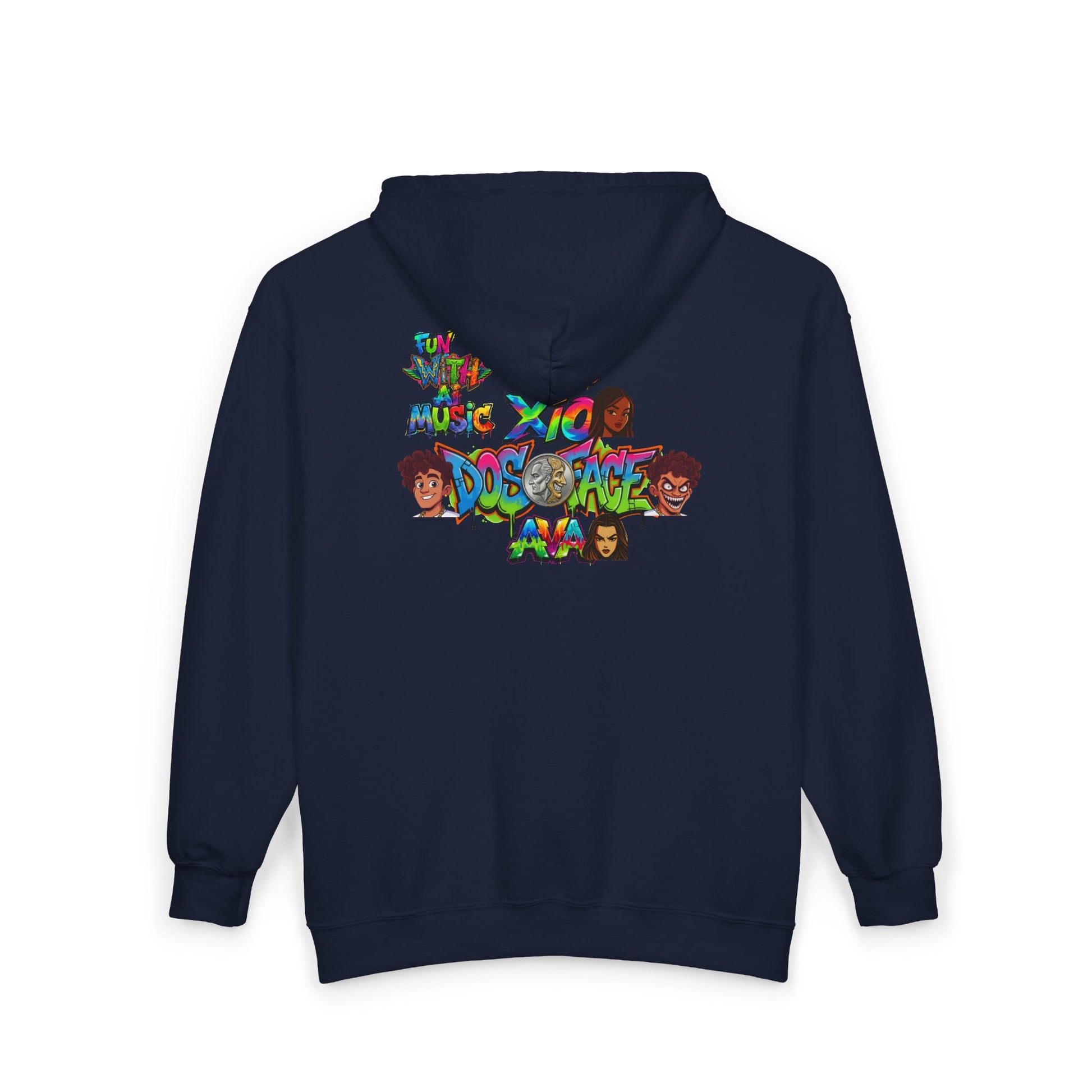 This zip-up hoodie brings a playful, nostalgic holiday scene into everyday wear. The front displays a vintage-inspired Pizzazz Records logo framed by glistening snow and city lights, while the back unfolds into a lively winter street tableau: a mischievous character strutting under colorful string lights, flanked by frosted storefronts. The medium-heavy 50/50 cotton-poly fabric feels sturdy and warm, and the full zip lets you layer it easily over tees or flannels. Spacious front pockets hold your phone and small essentials. Subtle wrist prints and an optional left-chest embroidery add handcrafted detail that collectors and music-lovers will notice. Wear it to stroll through holiday markets, spin vinyl by the tree, or cozy up at a late-night rooftop gathering.